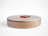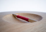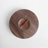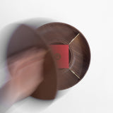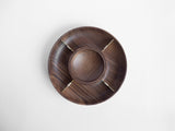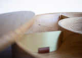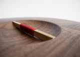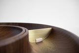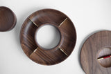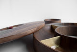 Craved out of solid walnut, with a removable centre bowl and outer ring quartered by brass partitions. The brass blades are secured down by the leather tabs which acts as padding under the candy box. The brass blades highlight the gentle curve profile while adding a touch of luxury and glamour to the festive celebrations.
