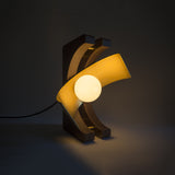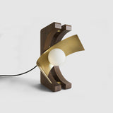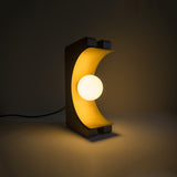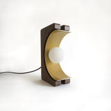 The concentric arches, one carved into the hefty base, and one formed from rolled brass; can be rotated to reflect contrasting characteristics of light. The Crescent was designed to create distinctive forms and project unique ambiances through movements between the two bodies and the orientation of the lamp itself.