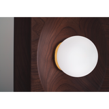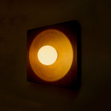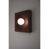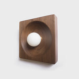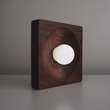 The opal glass ball nestled in the centre of the square, carved out of a single piece of solid walnut. The diffused light reveals the beautiful imperfections of its natural wood grain.